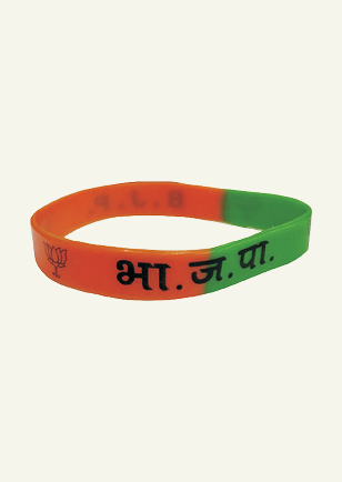 Printed in vibrant saffron and green campaign colors, the silicon band creates a strong visual identity and is commonly worn by supporters, volunteers, and campaign workers during rallies and election events.