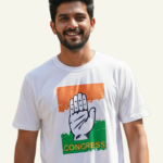 The T-shirt features the recognizable Congress hand symbol printed on a tricolor background (saffron, white, and green) with “CONGRESS” text, displayed prominently on the front. The bold graphic ensures the design remains clearly visible during rallies, campaign activities, and public gatherings. The white base fabric enhances the visibility of the print, helping supporters stand out even in large crowds.